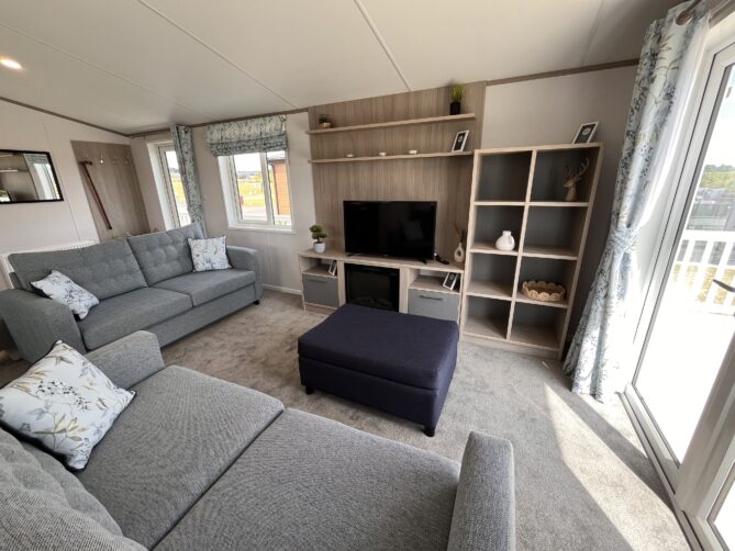 The Wisteria Lodge is a 20ft wide model with an expansive living space making a real statement inside and out. The open plan lounge with its twin French doors features freestanding sofas and plenty of built in storage space for all those holiday essentials.